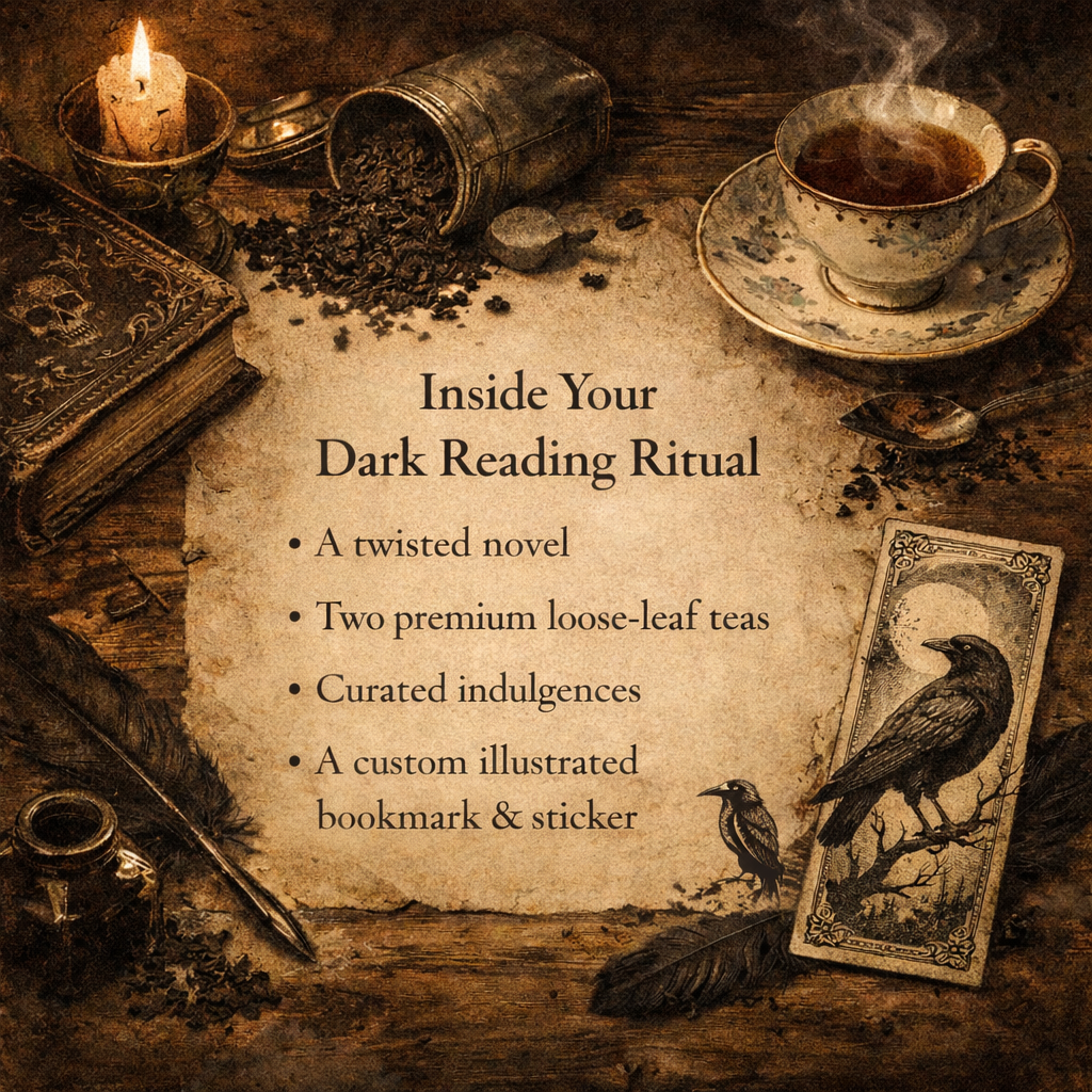 Each box is an immersive reading experience designed to thrill, unsettle, or haunt you. Inside: a twisted novel in your chosen genre, two premium loose-leaf teas, and a curated selection of indulgences chosen to match the emotional tone of the story. Every element is hand-packed with intention — and just a hint of menace.